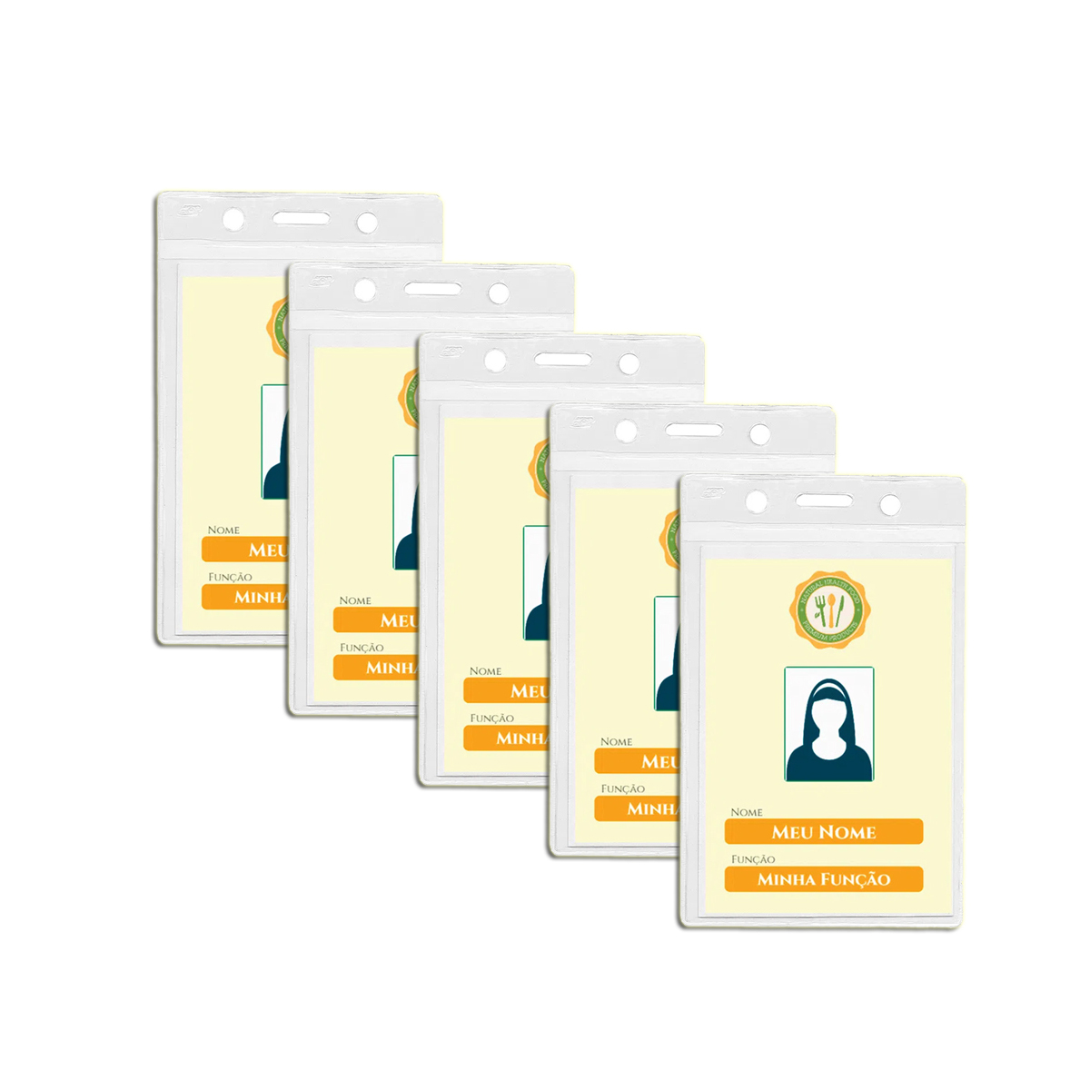 Sem presilha, o design permite a utilização com diferentes tipos de suportes, como cordões ou clipes, oferecendo flexibilidade na forma de uso. O tamanho de 10x7 cm é ideal para incluir informações essenciais como nome, cargo, e empresa, proporcionando visibilidade clara e legibilidade.