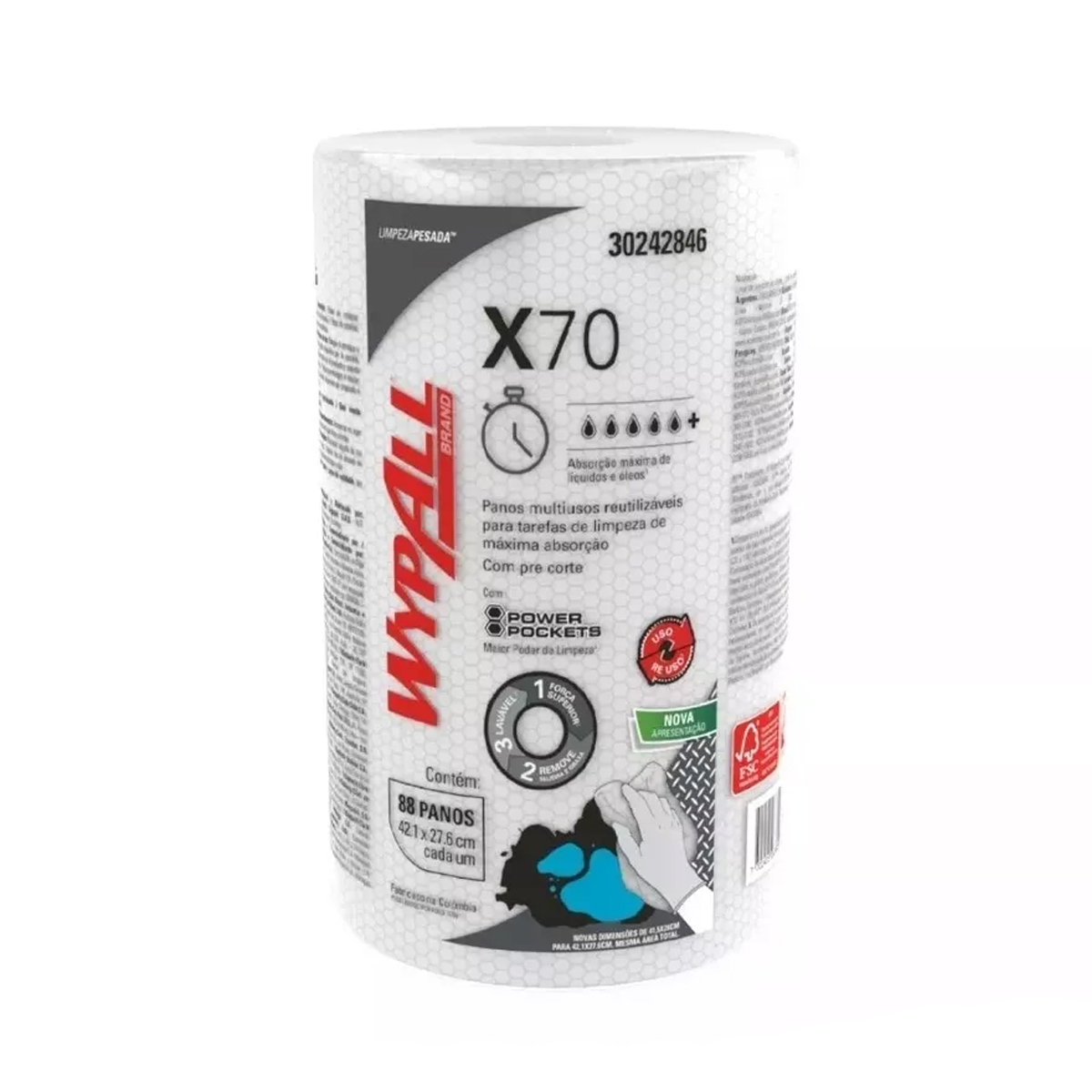 Apresentamos o Wyper Wypall X70 Plus Industrial, um produto para limpeza de alta performance. Produzido com tecnologia Hydroknit, combina polipropileno e celulose para excelente absorção e resistência. Seus Power Pockets garantem maior poder de limpeza em tarefas difíceis, aumentando eficiência e reduzindo desperdício. Ideal para limpar superfícies, peças, equipamentos, aplicação de líquidos e uso geral. Resistente a solventes e rasgos, com baixa liberação de partículas. Mede 42,1 x 27,6 cm, com composição de 87% celulose e 13% polipropileno. Cada rolo contendo 88 panos pré-picotados. Código SAP: 30242846. Eco friendly, biodegradável e não contaminante em aterros sanitários.